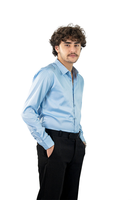 Light Blue Blue Men's Satin Slim Fit Shirt