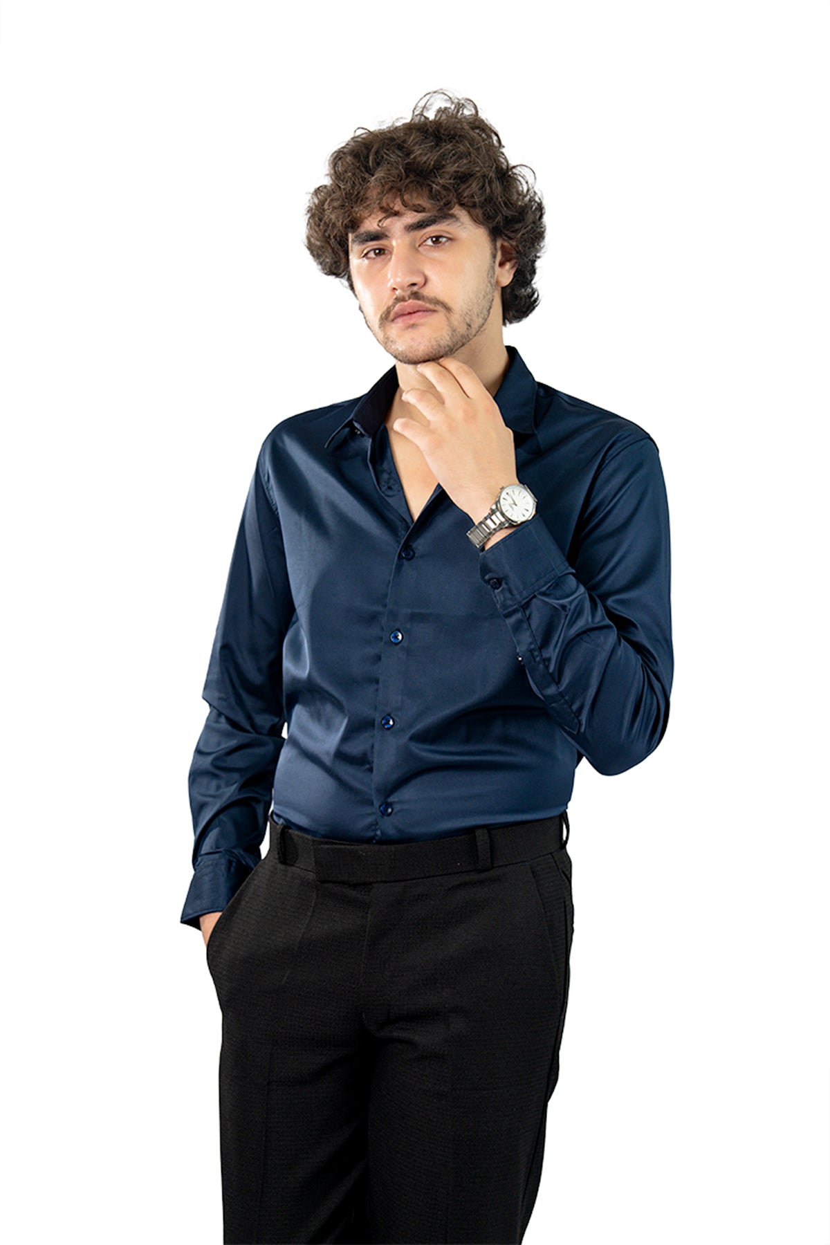 Bring refined elegance to your wardrobe with this navy blue satin shirt. Crafted in a slim fit with full sleeves, it offers a perfect balance of sophistication and comfort. The rich navy hue and smooth satin sheen make it an ideal choice for both formal occasions and stylish evenings out.